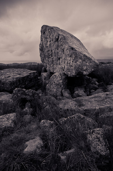 When it is wet, grey and generally dull with a gale blowing, apart from waves and barnacles on rocks it is generally a difficult time to try and make images. I was having one of those days last Wednesday, where it didn’t matter where I went, I just was struggling to find subjects that seemed to work. I eventually ended up at Arthur’s Stone on Cefn Bryn. Due to the rapidly declining weather I was up there on my own, so when a severe rain storm hit and visibility was reduced to 100m at least I didn’t have to fight with anybody to get the only sheltered spot under Arthur’s Stone itself. It doesn’t matter how good your waterproofs are, eventually the rain gets in, so I was glad for some shelter. I’m actually quite surprised that I was wearing my waterproofs. Normally I forget to take any for me and only carry the ones for my camera and bag!